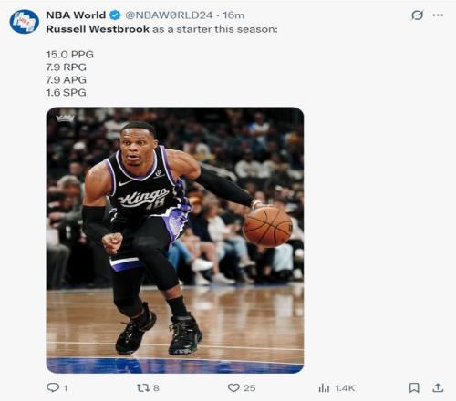 国王队官方也晒出推文祝贺拉塞尔-威斯布鲁克完成自己新的生涯里程碑。